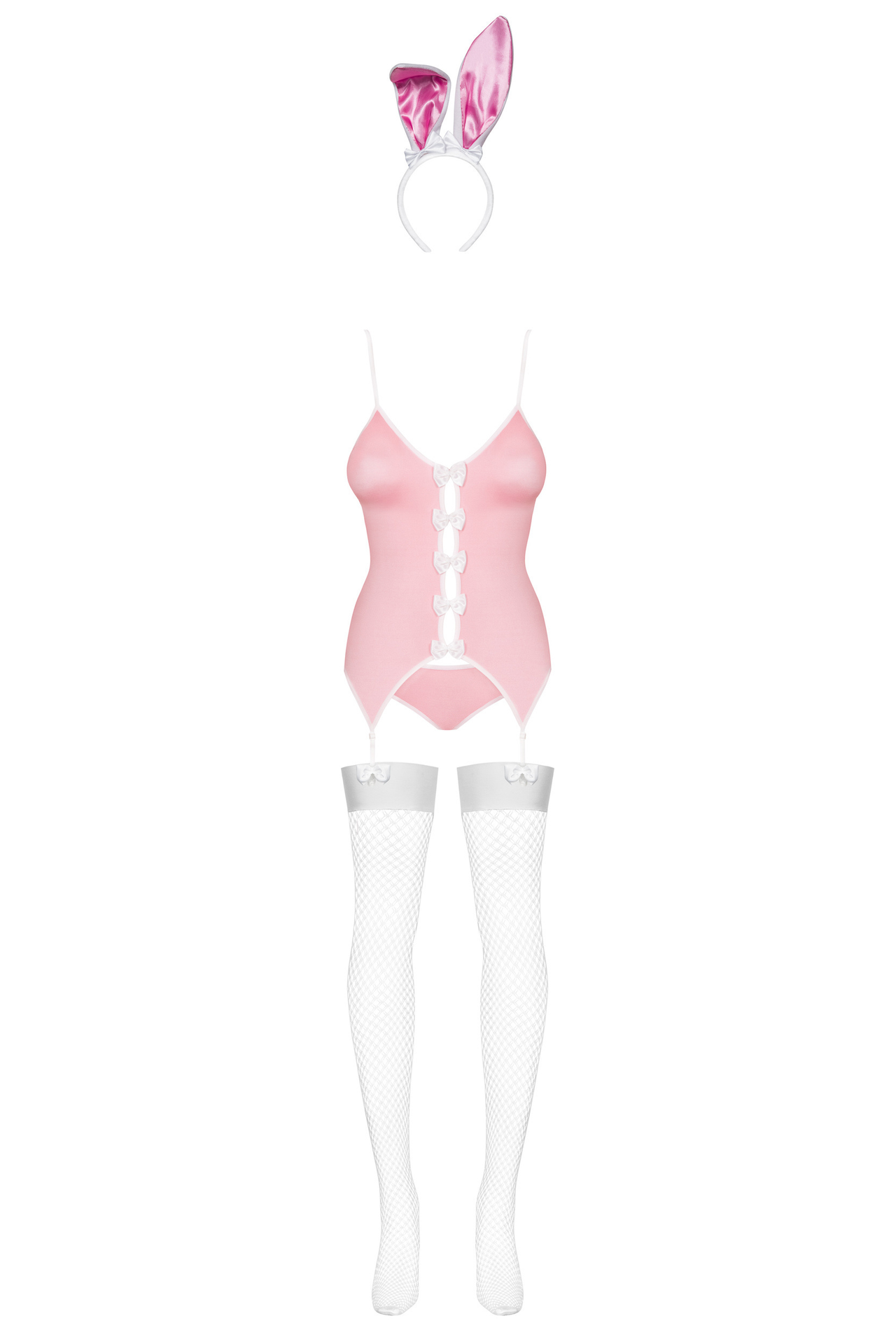 - Costumul include top cu portjartier, chiloți cu coadă de iepuraș, ciorapi și urechi;