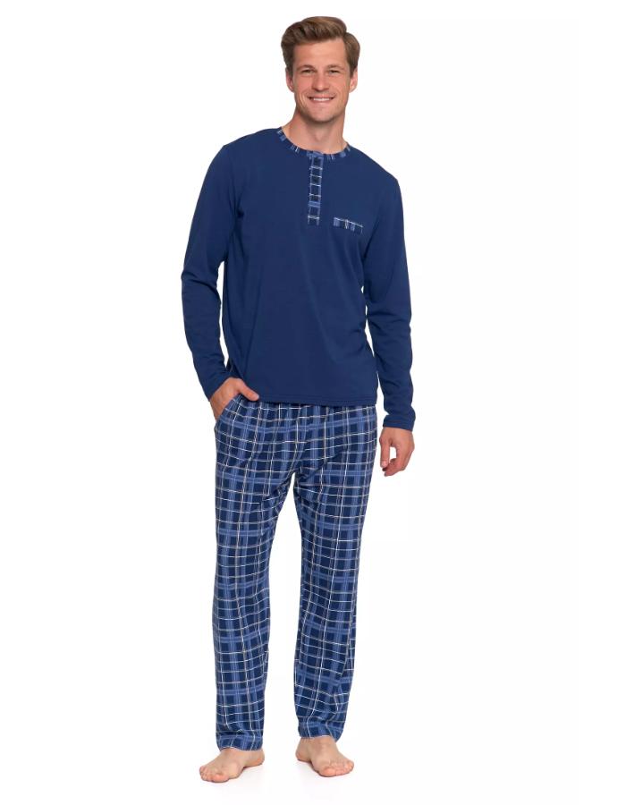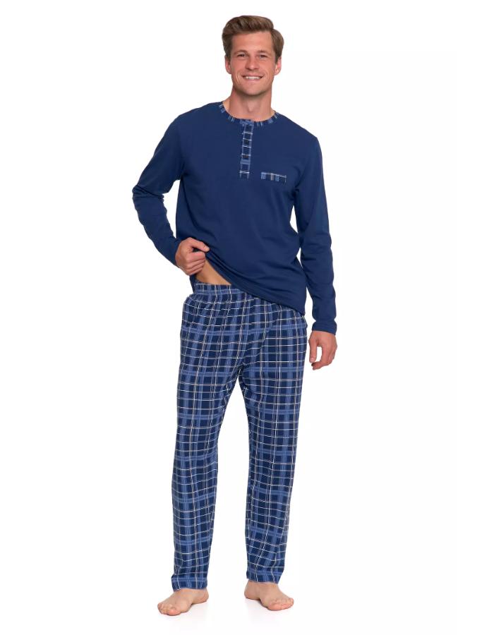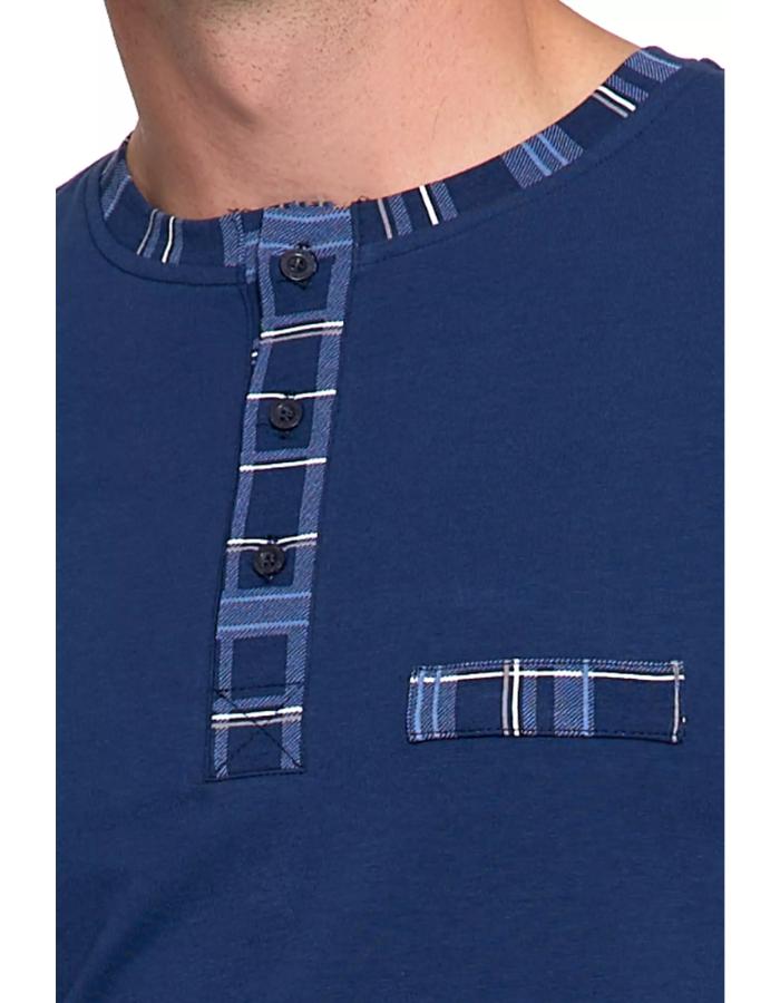 Iți plac stilurile clasice care nu se demodează niciodată? Acest set combină un top bleumarin închis cu pantaloni în carouri albaștri, clasici – perfecți pentru seri confortabile și un somn lung și confortabil. Topul este confecționat dintr-un jerseu moale și respirabil, cu decolteu Henley cu nasturi și inserții subtile în carouri la nivelul feței și al decolteului. Pantalonii lungi au o bandă elastică care nu strânge în talie, pentru o potrivire confortabilă și o mișcare nerestricționată. Croiul simplu și confortabil este perfect pentru purtare pe tot parcursul anului, iar jerseul moale de bumbac asigură o circulație excelentă a aerului.