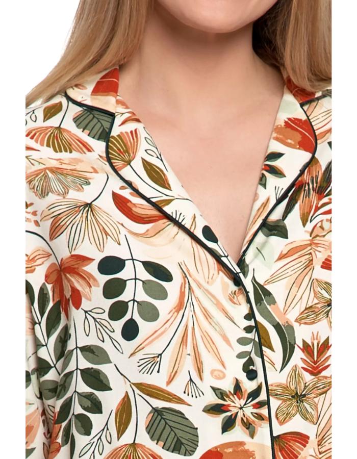 Aceste pijamale confortabile pentru femei, confecționate din viscoză moale și respirabilă, combină confortul cu un aspect elegant. Bluza cu nasturi și guler clasic adaugă o notă atemporală, în timp ce pantalonii lungi cu talie elastică și nod asigură o potrivire perfectă. Modelul subtil și atrăgător adaugă o notă feminină și face ca pijamalele să fie deosebit de atractive. Sunt alegerea perfectă atât pentru relaxarea de seară acasă, cât și pentru un somn odihnitor și confortabil.